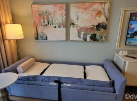 2 queen beds, and 1 day bed. Full bath. Resort Studios will not have a typical DVC kitchenette, yet will have a beverage cooler.
