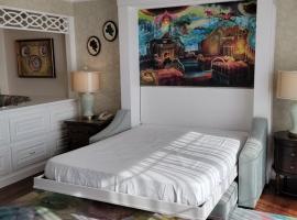 1 queen size bed, 1 queen size pull-down wall bed, and 1 pull-down bunk size bed. Full bath.