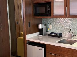 1 queen size bed, 1 queen size pull-down bed and full bath.