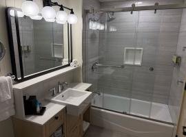 1 queen size bed and 1 double size sleeper sofa. Full bath.