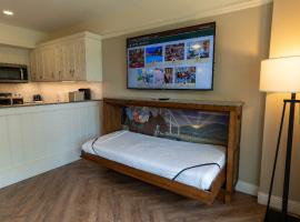 King size bed in the master bedroom. Full kitchen. Full bath and in suite laundry. Living room with 1 queen-size pull-down bed, and 1 pull-down bunk-size bed.